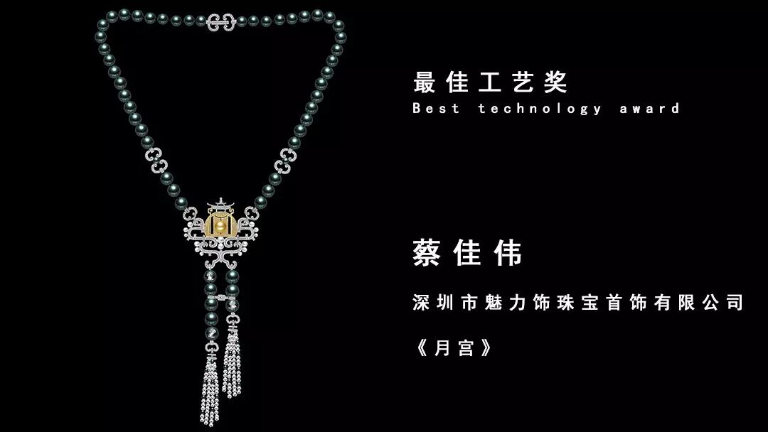 2018 shanxihu pearl jewelry design competition is jointly held by China jewelry and jade jewelry industry association and zhuji municipal people's government. It aims to encourage the cultivation of a new generation of designers to forge ahead and innovate, to show the appearance of today's Chinese pearl industry, to promote the Chinese pearl fashion culture, and to lead the Chinese pearl culture to blossom on the world stage. Designer said When designing at the beginning, when a work is designed for the theme with rhyme Oriental, look up at the moon, thought imperceptibly drifted to the moon whether there is a moon palace? In my mind, the image of the golden moon appeared in front of me. This piece of work is inspired by the mythical moon palace. Since ancient times, people have been longing for the moon with endless defects. There are folk myths such as chang 'e running to the moon, three rabbits making a scene on the moon, as well as classics such as literati homesick for the moon and state anxiety. The moon is no longer an ordinary planet in the eyes of the Chinese. Every kind of image is attached to the inheritance of emotion and culture. Winning work "moon palace" 模特展示蔡佳偉作品《月宮》 awards